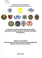Соціальні аспекти військово-професійної діяльності сектора безпеки і оборони: виклики сьогодення [Текст] : зб. тез доп.І Міжнар. наук.-практ. конф. (Харків, 20 травня 2021 р.) / Гол. упр. Нац. гвардії України [та ін.]. – Харків : НАНГУ, 2021. – 333 с. – У надзаг.: Нац. акад. Нац. гвардії України.