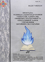 Програма індивідуальної підготовки генералів, адміралів, офіцерів стратегічної та оперативної ланок управління Збройних Сил України [Текст] : ВКДП 7-00(03).01 : військ. керівна деталіз. публ. військ. організац. структурам стратегіч. та операт. ланок упр. з порядку планув. індивід. підгот. / Гол. упр. доктрин та підгот. ГШ ЗСУ. – [Київ, 2021]. – 35 арк. – Бібліогр.: арк. 35 (4 назви). – Дод. 1-6.