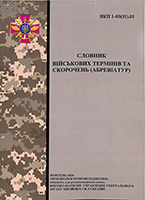 Словник військових термінів та скорочень (абревіатур) [Текст] : ВКП 1-00(01).01 : військ. кер. публ. заг. застосування J-структурами ГШ ЗСУ / Воєн.-наук. упр. ГШ ЗСУ. – [Київ, 2020]. – 48 с. – У вих. дан.: жовтень 2020.