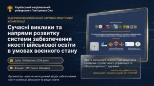 У відповідності до плану наукової і науково-технічної діяльності Харківського національного університету Повітряних Сил імені Івана Кожедуба на 2026 рік, в науково-методичному відділі забезпечення якості освітньої діяльності та вищої освіти Харківського національного університету Повітряних Сил імені Івана Кожедуба 18 березня 2026 року була проведена Всеукраїнська науково-практична конференція на тему: “Сучасні виклики та напрямки розвитку системи забезпечення якості військової освіти в умовах воєнного стану”.