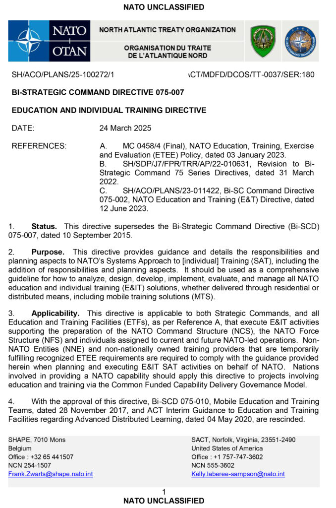 Bi-SC Command Directive 075-002, NATO Education and Training (E&T) Directive, dated 12 June 2023