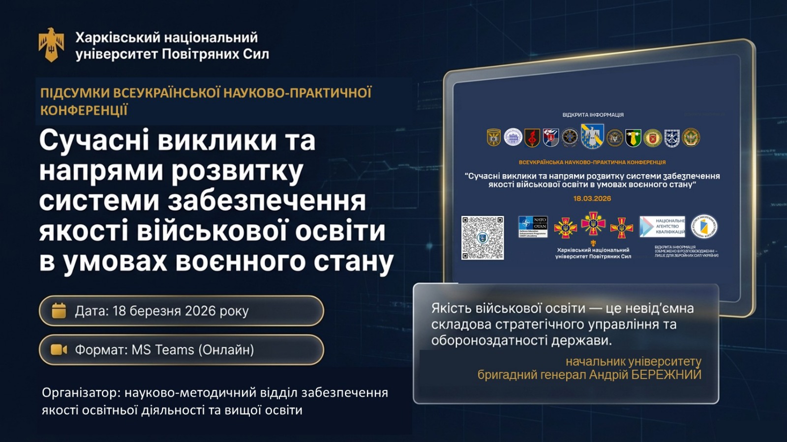 У відповідності до плану наукової і науково-технічної діяльності Харківського національного університету Повітряних Сил імені Івана Кожедуба на 2026 рік, в науково-методичному відділі забезпечення якості освітньої діяльності та вищої освіти Харківського національного університету Повітряних Сил імені Івана Кожедуба 18